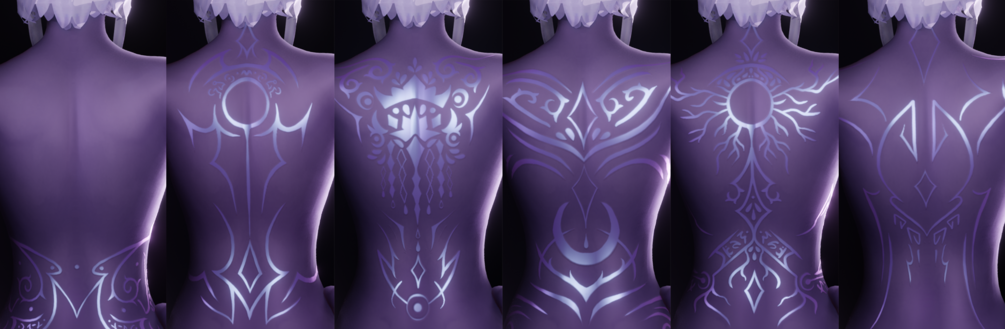 Included in this pack, you'll find 12 black-and-white PNGs - these are Nightborne-inspired tattoos both with and without facial markings - kept black and white so that you can alter the colour yourself rather than having to pick apart a texture with skin colour underneath. You'll also find my own preview images of the tattoos in full resolution as examples of them in my own setup as well as a simple example of how I might set up the nodes in Blender to overlay the textures over a base.